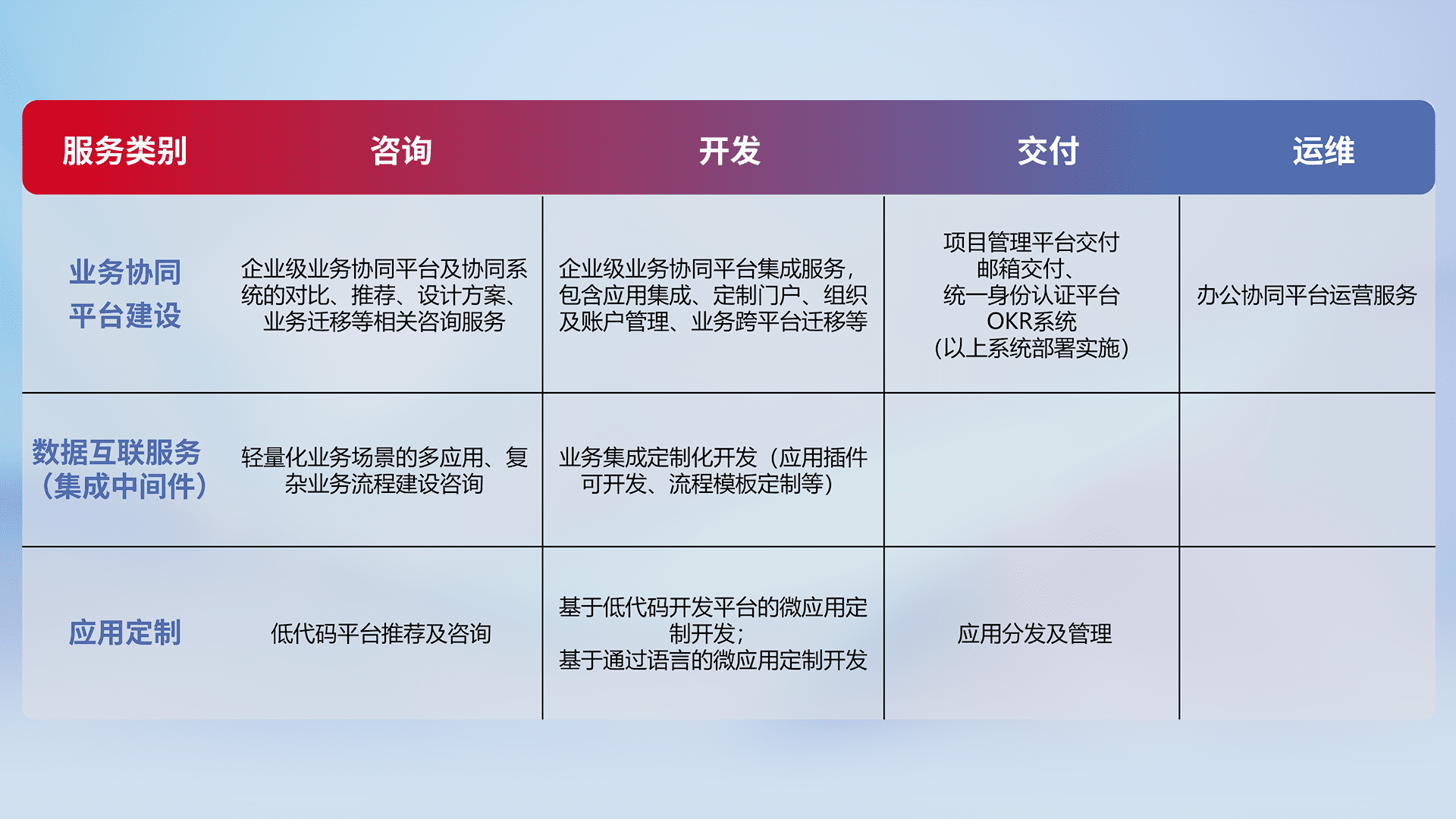 针对钉钉、、、、企微、、、、IDaas等平台级产品提供产品的规划、、、、方案、、、交付、、、、定制化开发等服务,,实现如统一协同办公、、智能客户服务、、混合会议管理、、、、智能数据查询、、、等业务场景,,实现数字化转型。。。